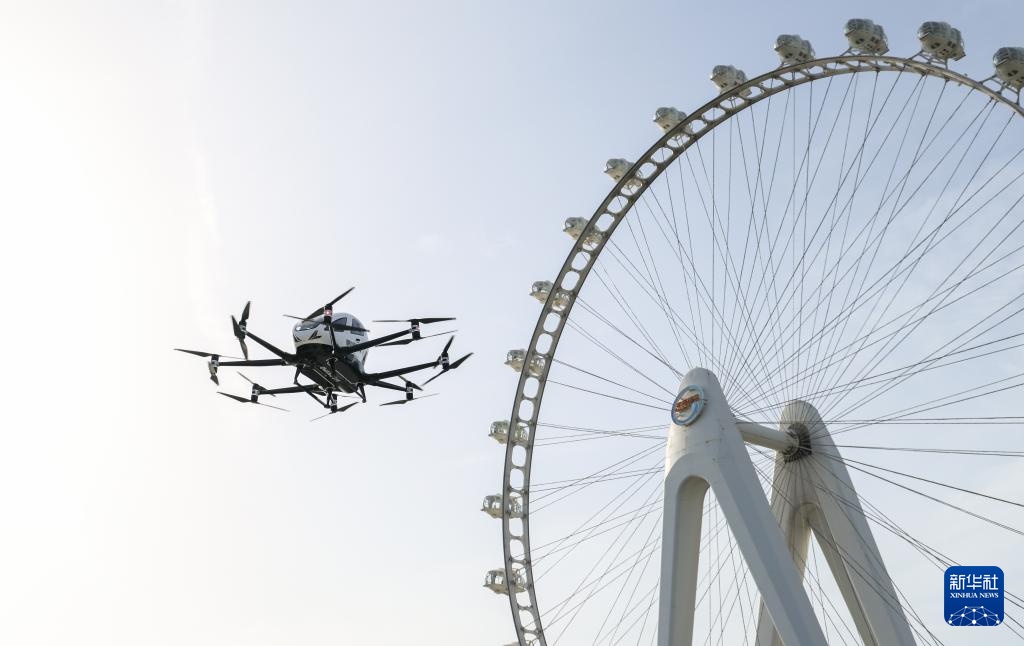 在深圳市宝安区城市空中交通运营示范中心,亿航eVTOL航空器进行展示飞行(4月16日摄)。