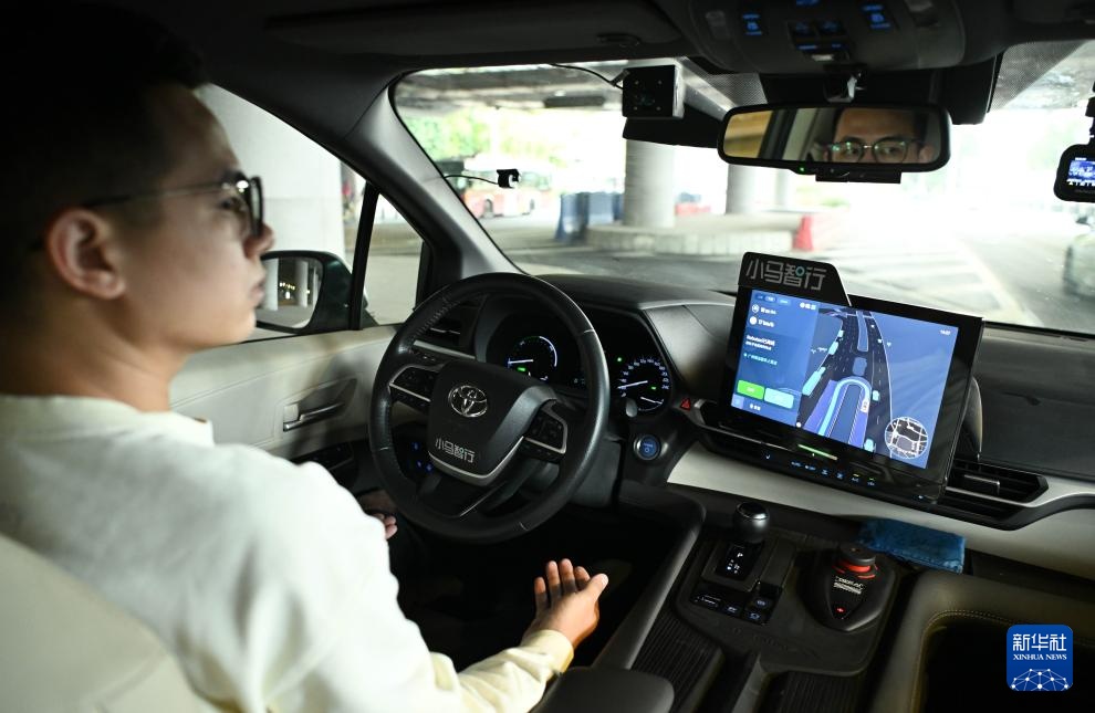 在广州塔的停靠点,配备有安全员的小马智行自动驾驶示范运营专线出租车自主转向(3月11日摄)。