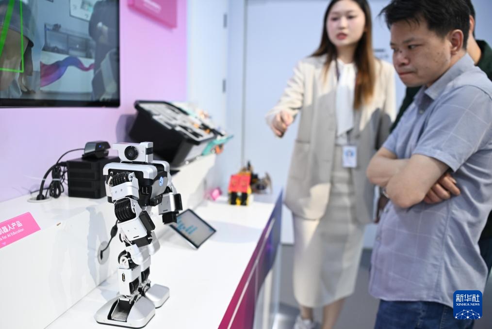 在深圳优必选科技股份有限公司的展厅,观众观看教育机器人产品(3月26日摄)。