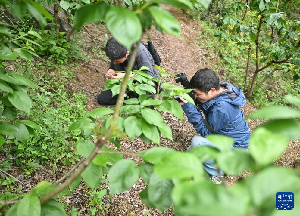 4月11日,胡君(右)、罗垚在观察成都卫矛生长情况。