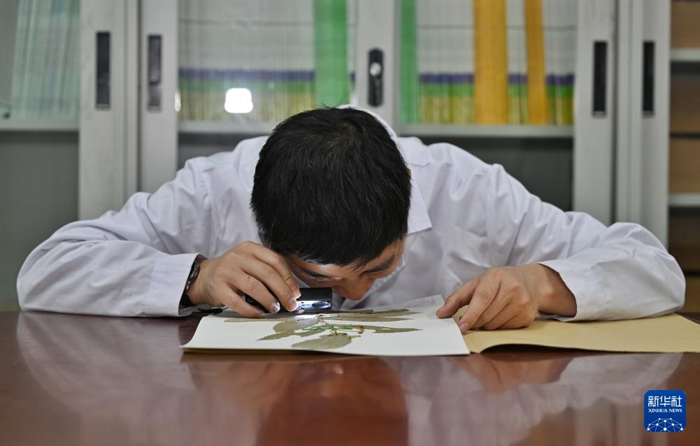 4月11日,在中国科学院成都生物研究所,胡君在观察成都卫矛的标本。