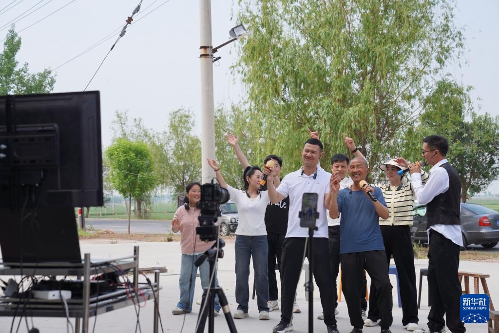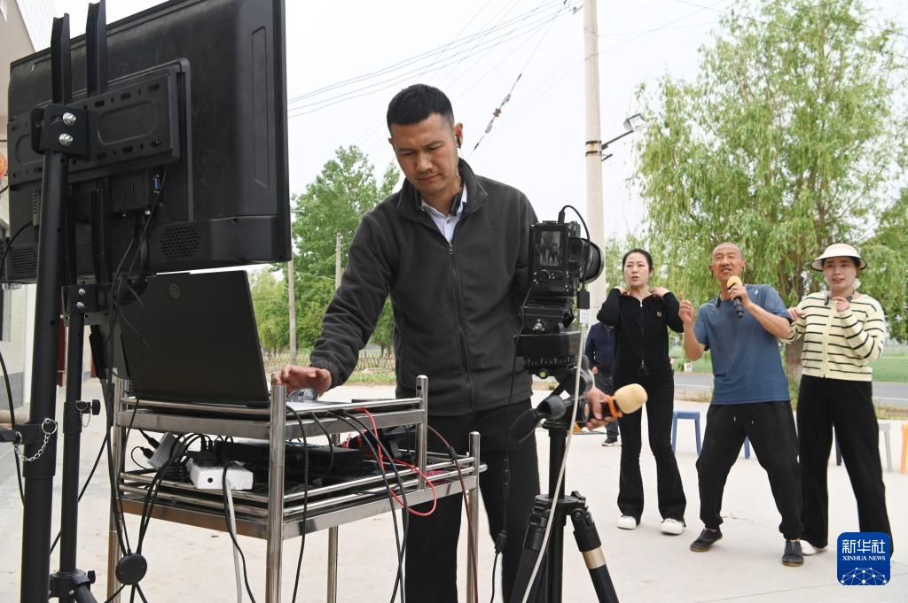 4月20日,康建庄(右)和康开放父子俩在田野上直播唱歌。
