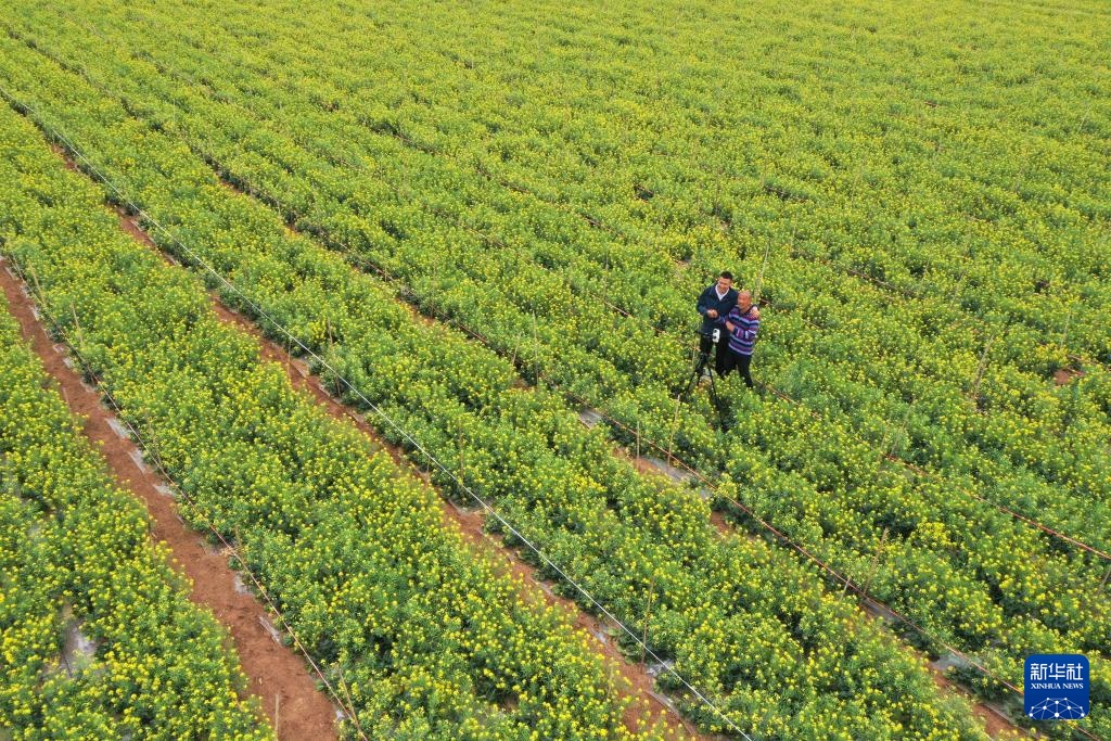 4月21日,康建庄(右)和康开放父子俩在田野上直播唱歌(无人机照片)。