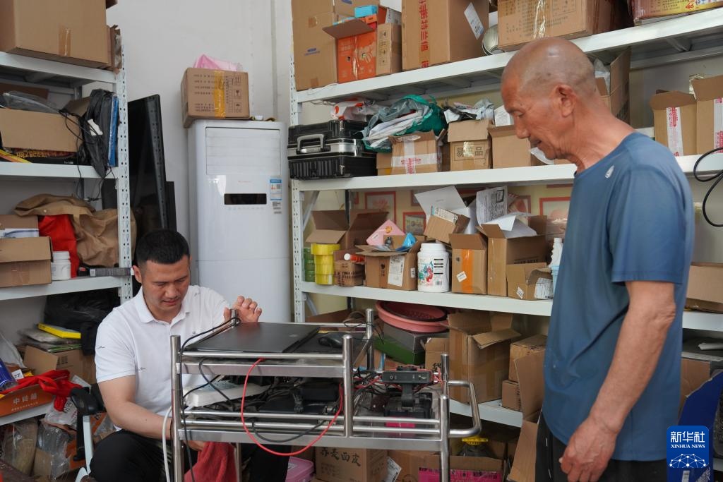 4月20日,康建庄(右)和儿子康开放在整理直播使用的设备。
