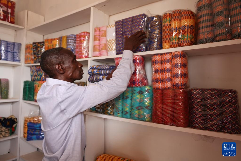 3月13日,在加纳阿散蒂省库马西市,商家在商店内整理“肯特布”。
