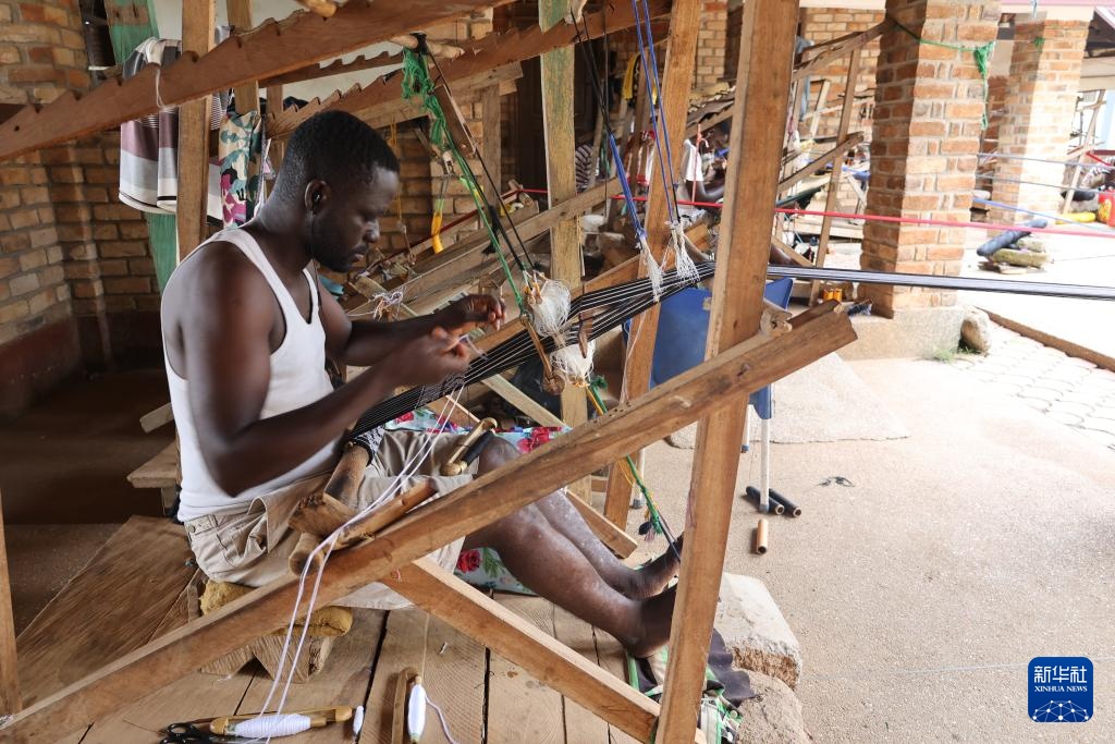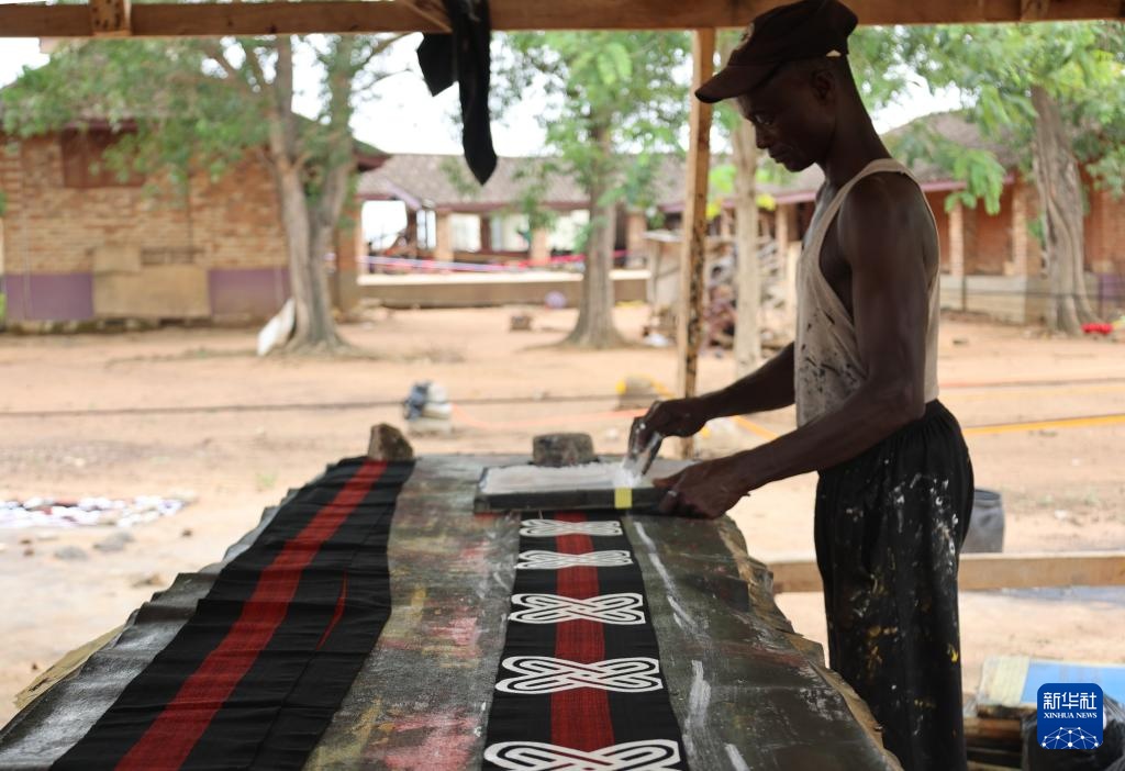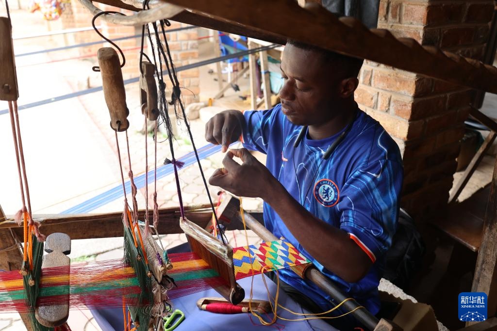 3月13日,在加纳阿散蒂省库马西市,一名织工在工坊制作“肯特布”。