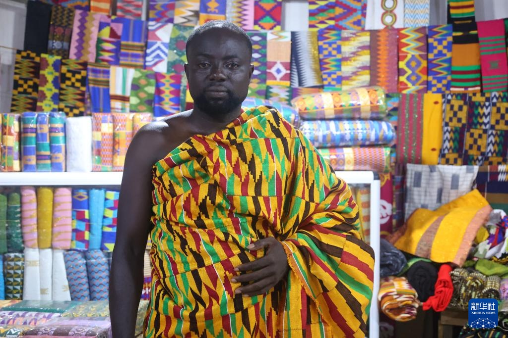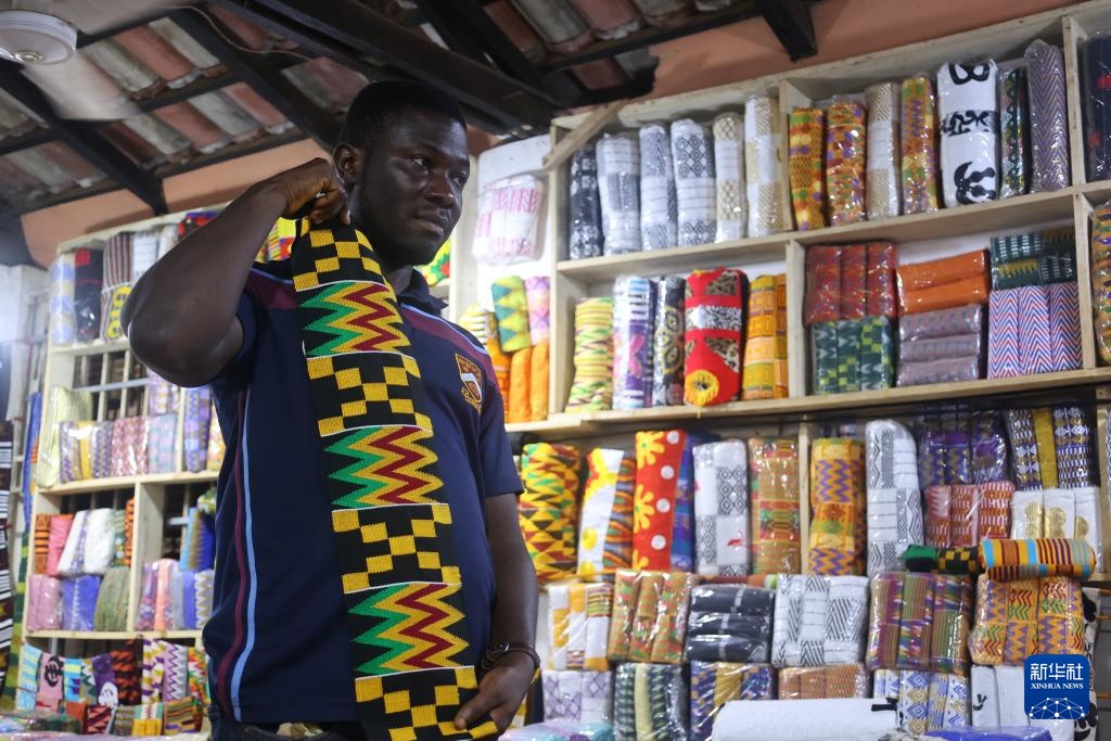 3月12日,在加纳阿散蒂省库马西市,一名男子在商店内展示“肯特布”。