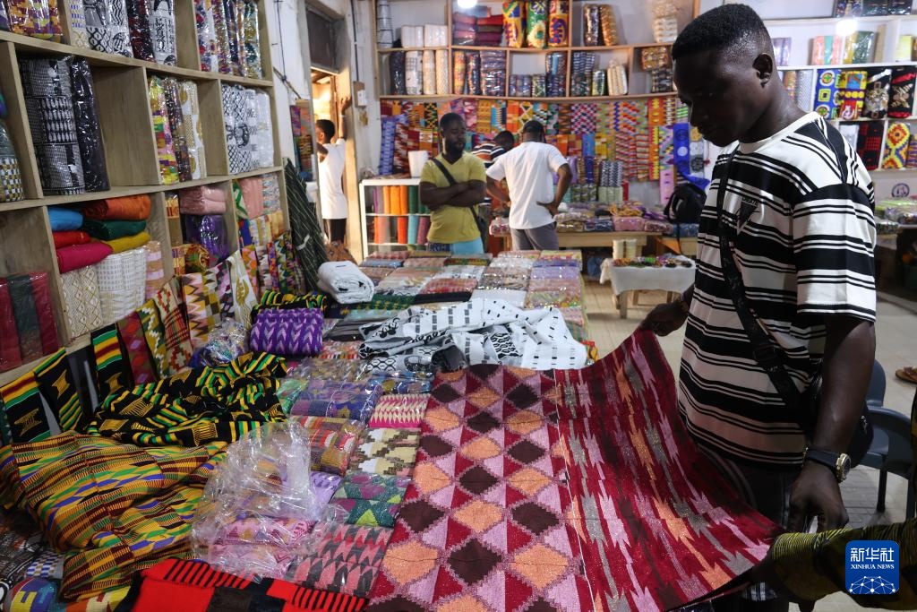 3月13日,在加纳阿散蒂省库马西市,一名顾客在商店内选购“肯特布”。