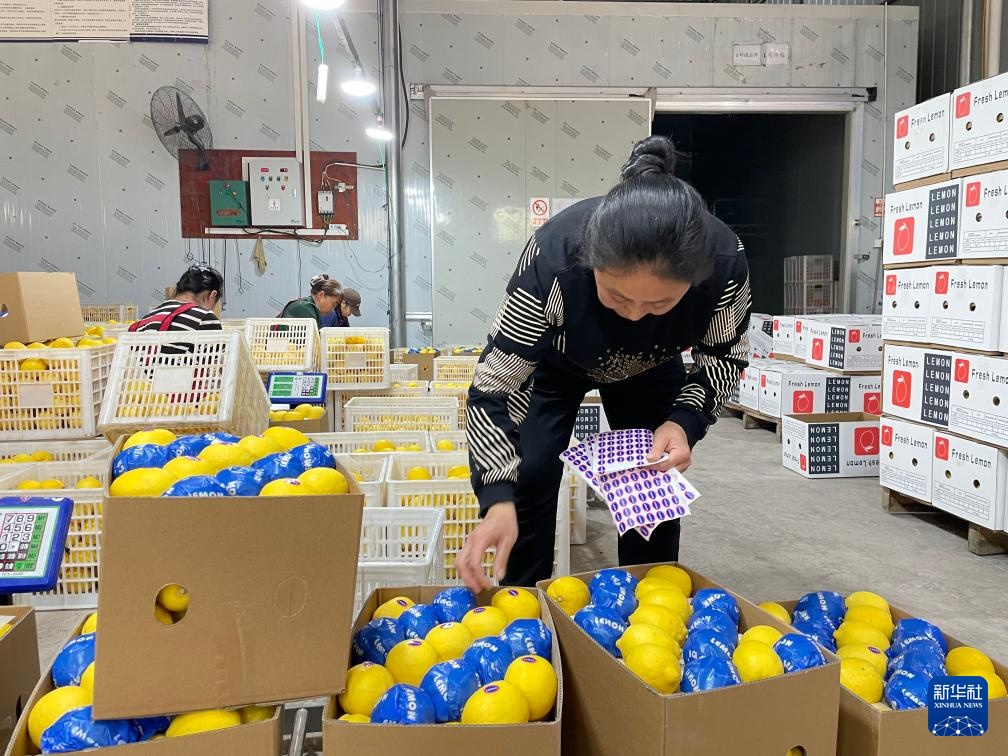 重庆磊书果品有限公司的工人在包装车间为筛选出来的柠檬鲜果贴签(4月14日摄)。待检验检疫合格后,这批28吨柠檬鲜果将通过陆海新通道公路班车冷链运输直达越南。