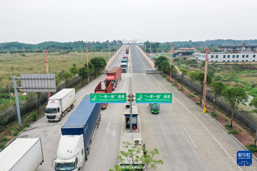 在广西凭祥友谊关口岸,装载着来自中国和东盟国家特色农产品的货车通过口岸(无人机照片,3月21日摄)。
