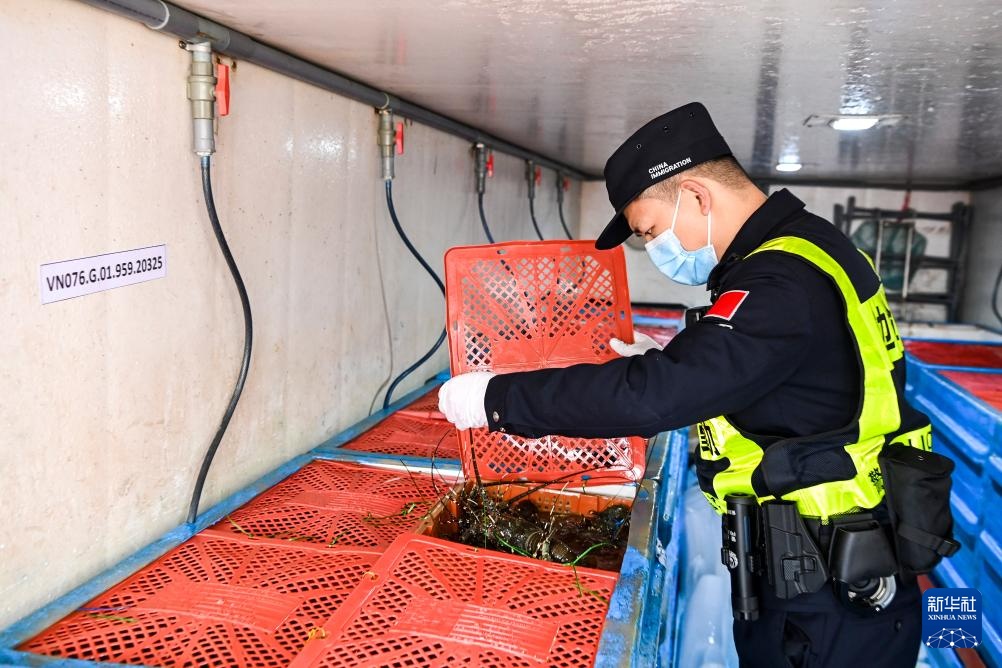 在广西东兴口岸,边检人员对进口的鲜活水产品进行查验(3月18日摄)。