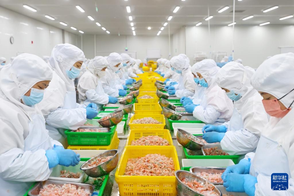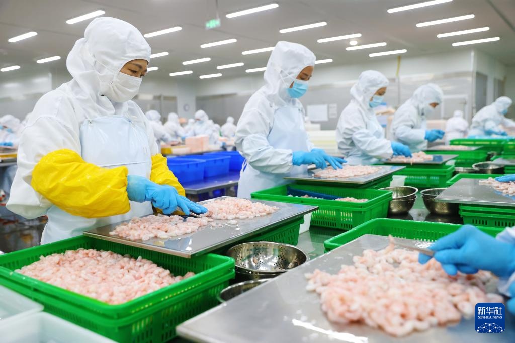 在位于武陵山区的重庆佳加荣食品有限公司的车间内,工人对经陆海联运送达的北极甜虾进行加工处理(4月19日摄)。