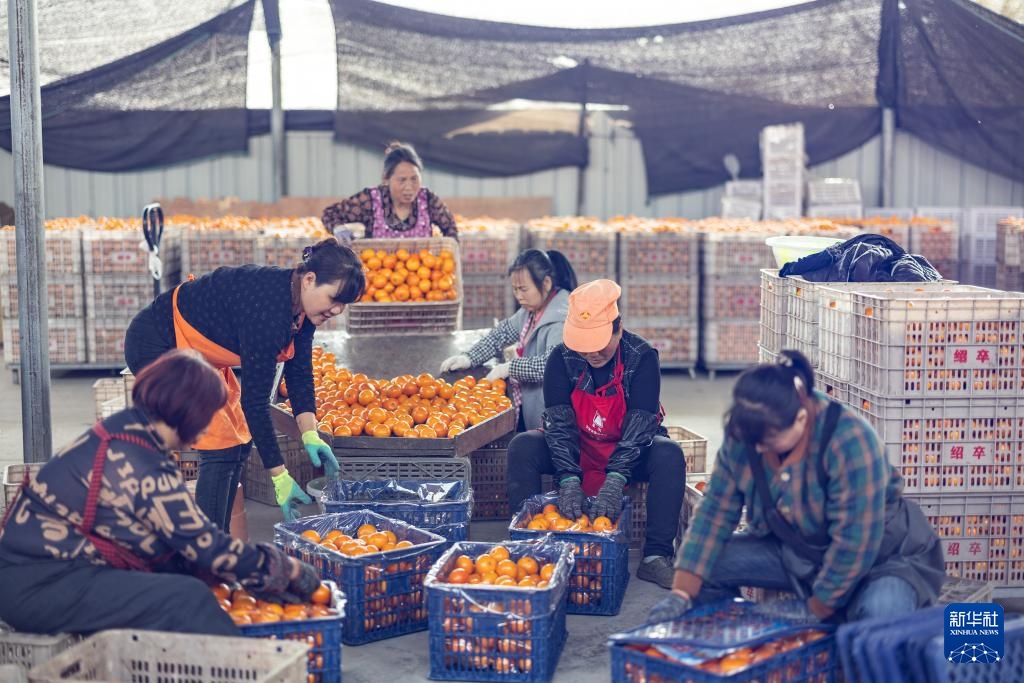 重庆市长寿区龙河镇保合村村民将挑选的柑橘装箱(3月24日摄)。这一批柑橘经过分选、清洗、装箱等流程后,将搭乘西部陆海新通道班列进入东南亚市场。