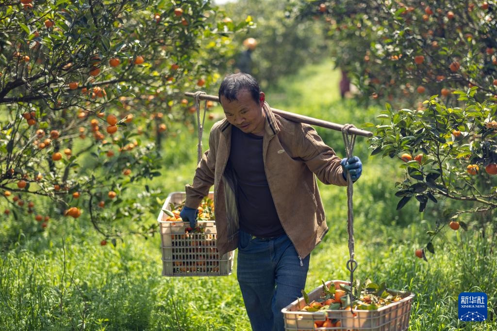 重庆市长寿区龙河镇河堰村村民在果园内挑运采摘的柑橘(3月24日摄)。这一批柑橘经过分选、清洗、装箱等流程后,将搭乘西部陆海新通道班列进入东南亚市场。