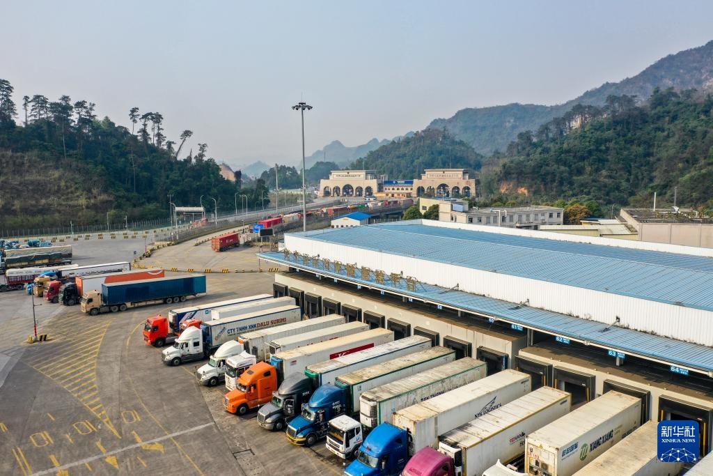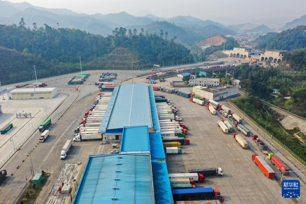 在广西东兴口岸,大批货车排队通关(无人机照片,3月18日摄)。这些货车运输的货物,有的是来自中国的特色农产品,有的是东盟国家的特色农产品。