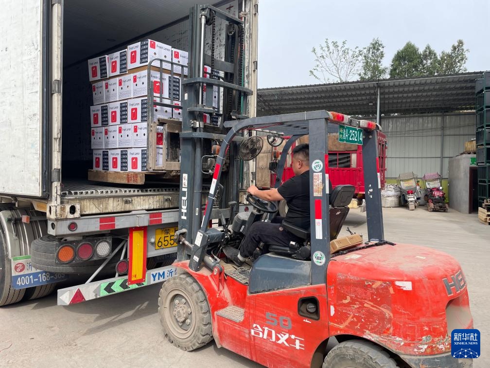 重庆磊书果品有限公司的工人将打包好的柠檬鲜果放入冷链班车(4月14日摄)。待检验检疫合格后,这批28吨柠檬鲜果将通过陆海新通道公路班车冷链运输直达越南。