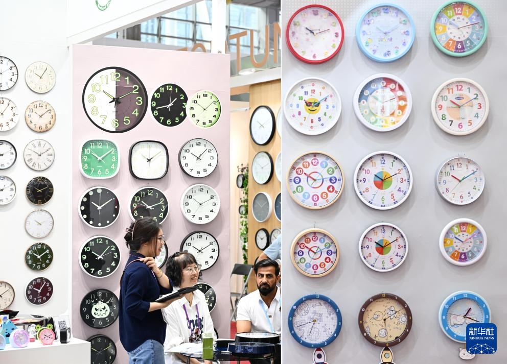4月23日,在第137届广交会上,境外采购商在钟表展区洽谈。