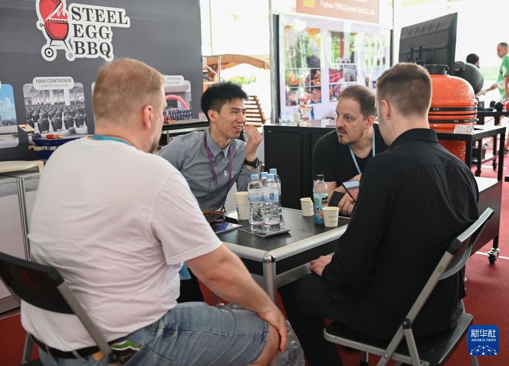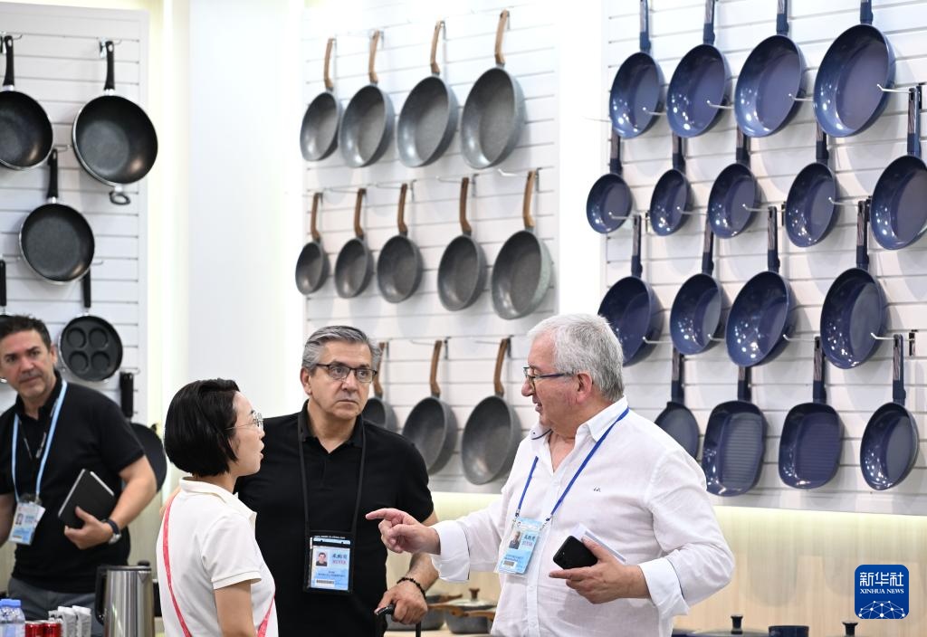 4月23日,在第137届广交会上,境外采购商在厨具展区洽谈。
