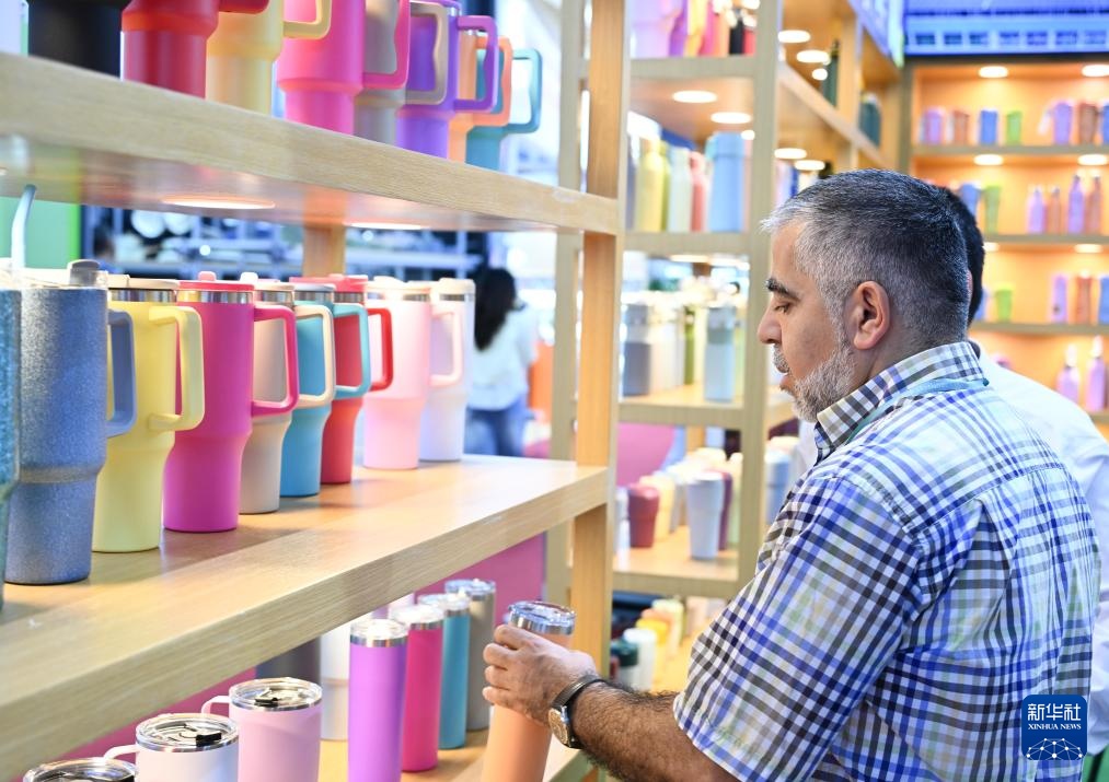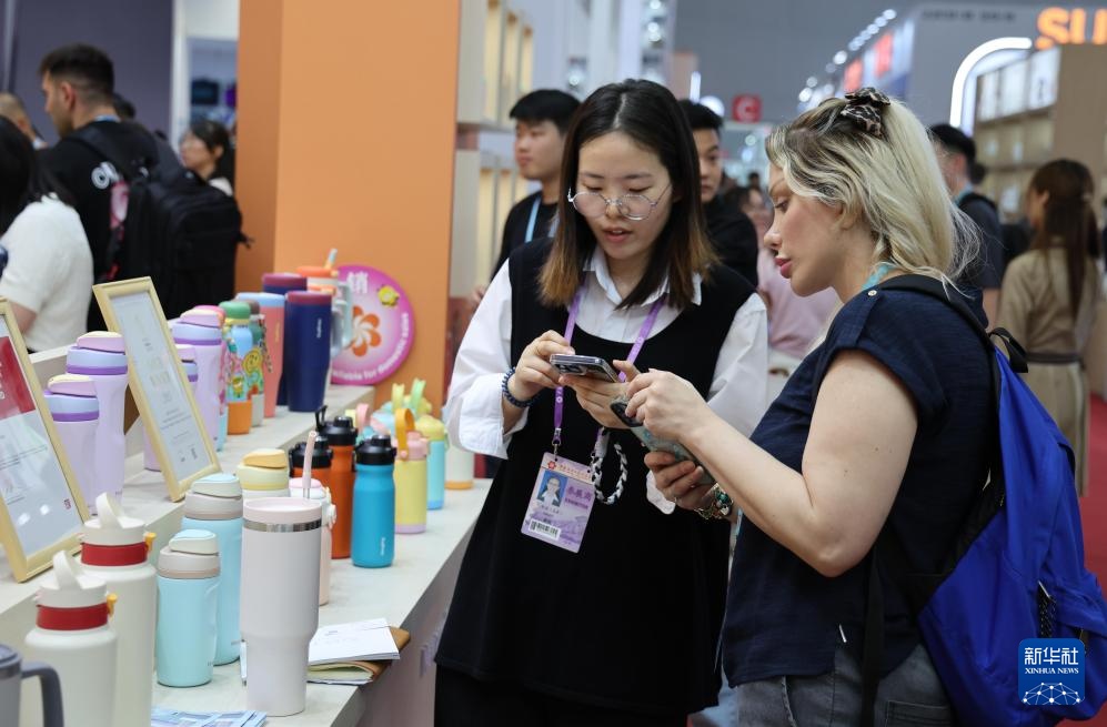 4月23日,在第137届广交会上,境外采购商观看水壶产品。
