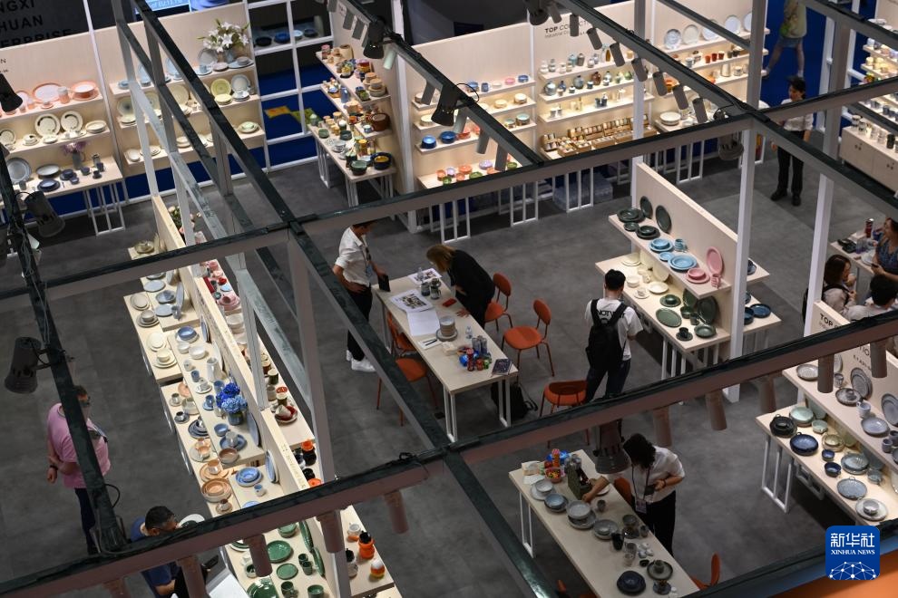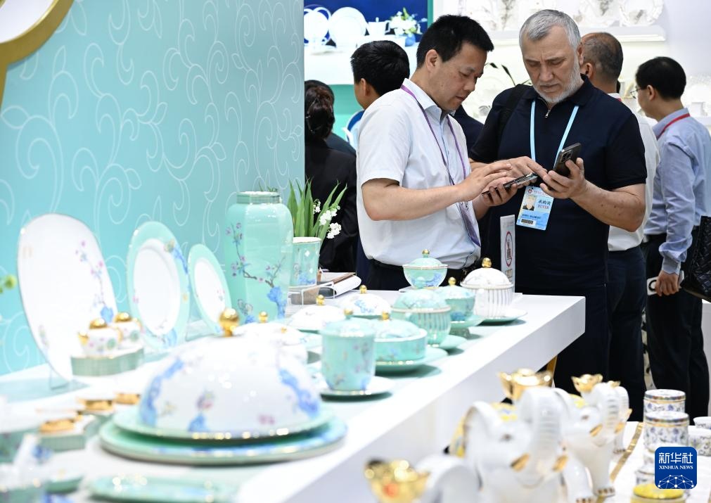 4月23日,在第137届广交会上,境外采购商在瓷器展区洽谈。