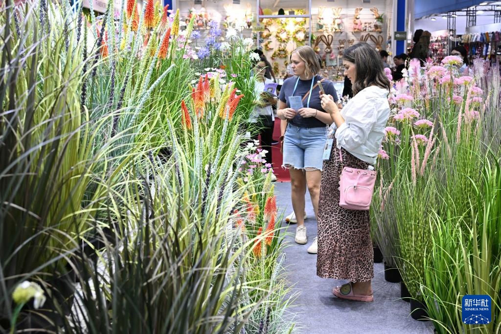 4月23日,在第137届广交会上,境外采购商观看仿真花展区。