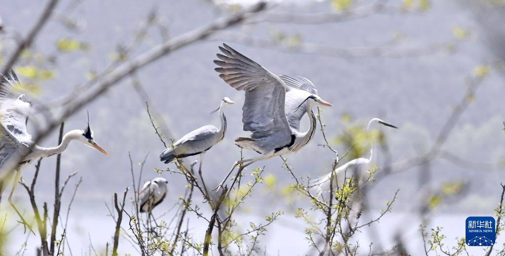 在密云水库觅食喂养小鸟的苍鹭群(4月23日摄)。