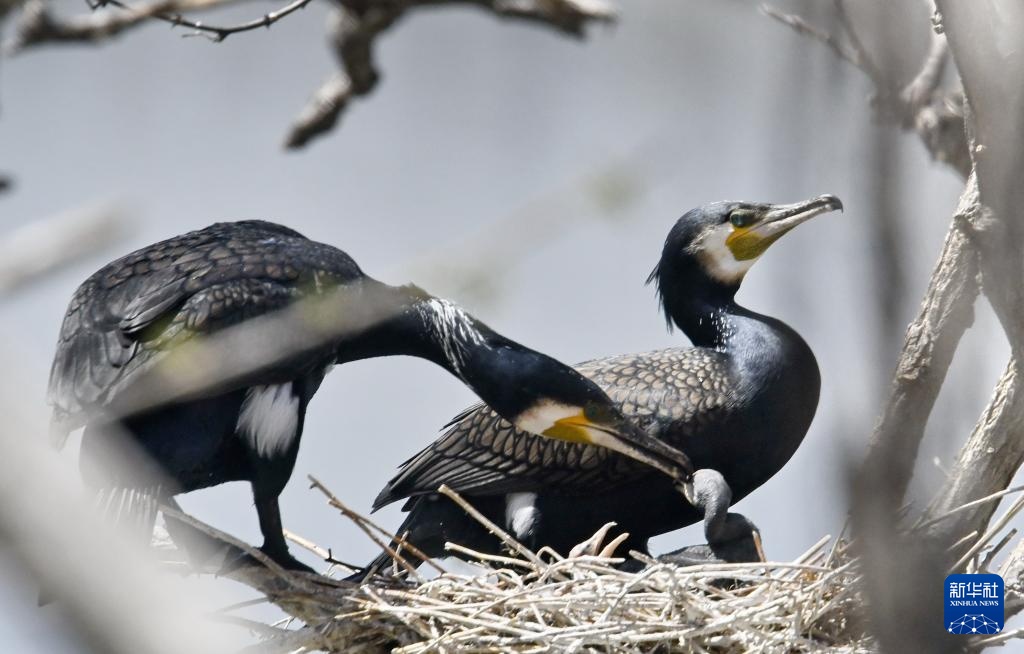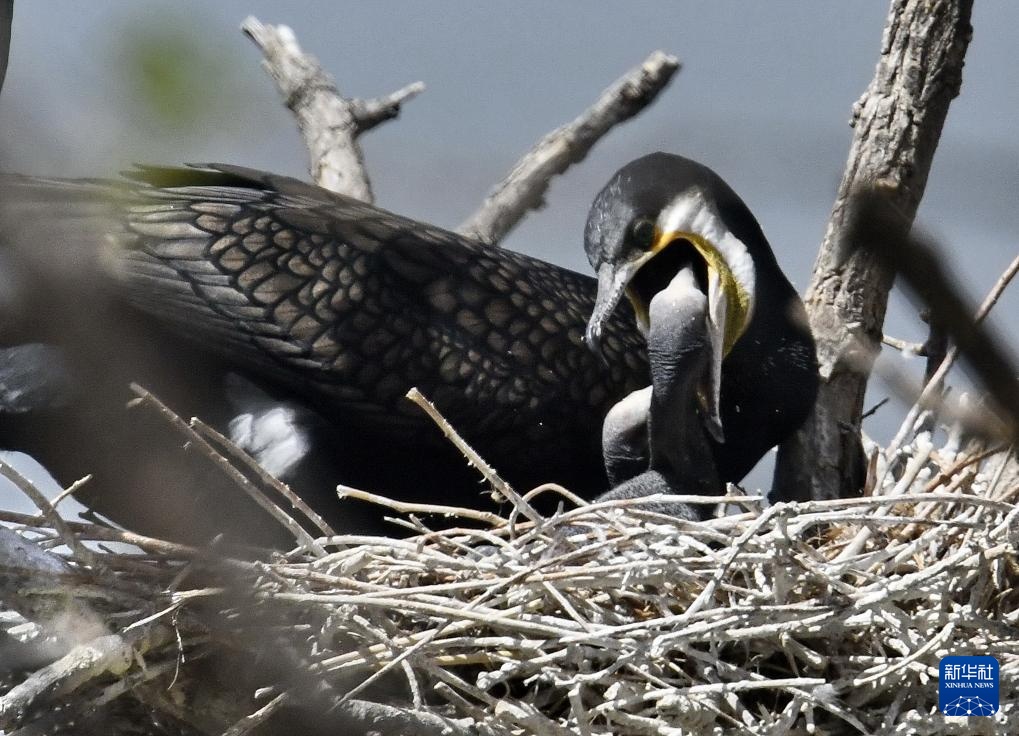 密云水库鸟岛上哺育小鸟的鸬鹚(4月23日摄)。