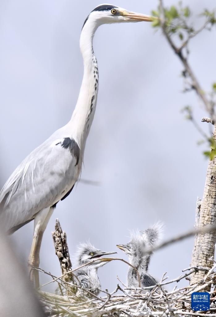 在密云水库鸟岛拍摄的守护着小鸟的苍鹭(4月23日摄)。