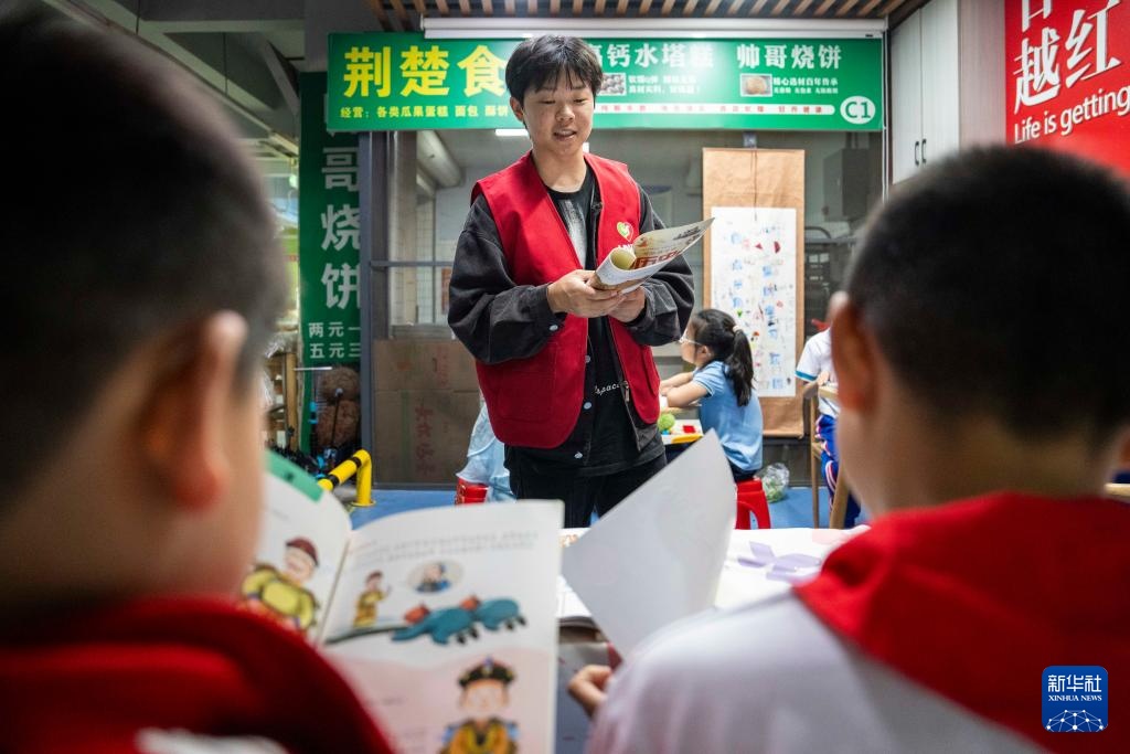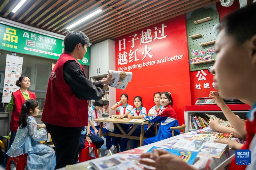 4月23日,志愿者在长沙华夏农贸市场“四点半角”带领学生阅读书籍。