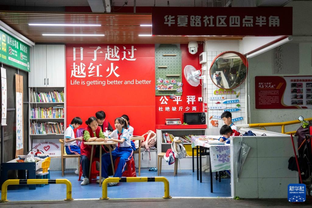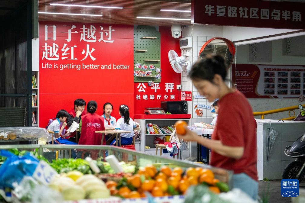 华夏农贸市场建成于2017年,市场面积约3700平方米,有100余家商户。约九成的商户子女在附近中小学读书。每天下午放学以及寒暑假里,多数孩子曾只能在父母的摊位上写作业和休息。“四点半角”用淡淡书香浸润市井烟火,为城市增添了一抹温暖亮色。
