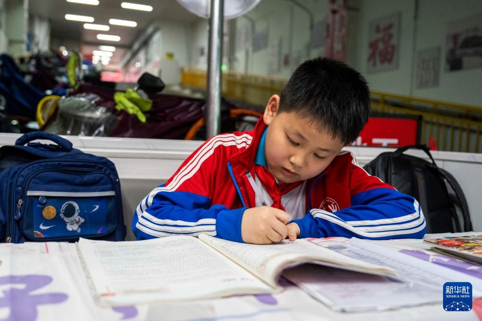 4月23日,学生在长沙华夏农贸市场“四点半角”写作业。