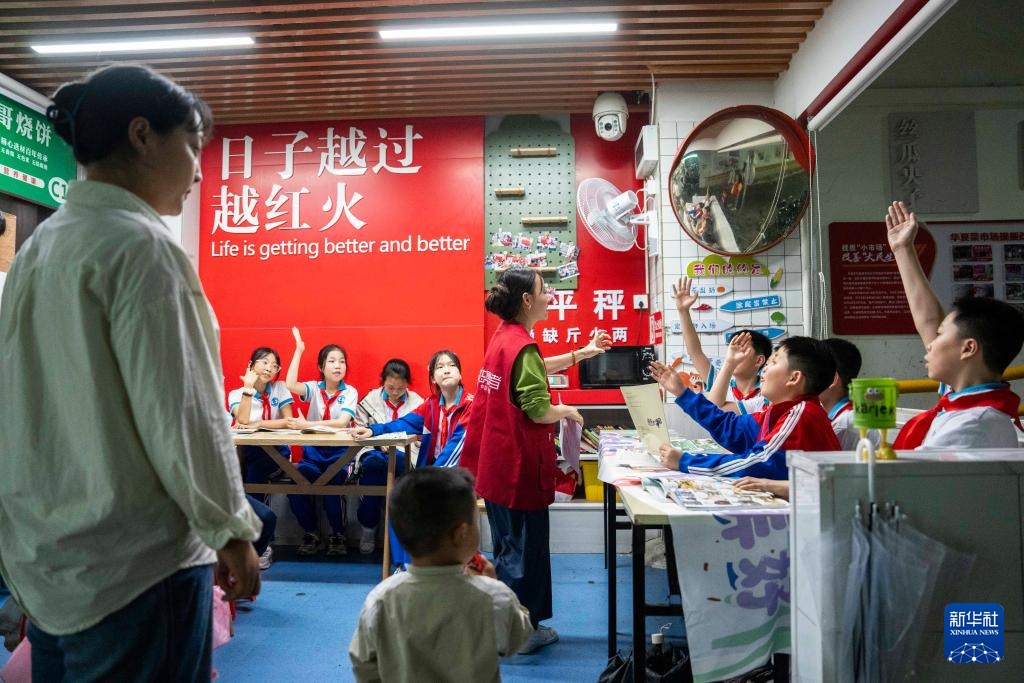 4月23日,志愿者在长沙华夏农贸市场“四点半角”与学生交流。