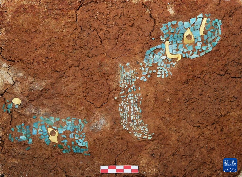 湖北黄陂盘龙城遗址杨家湾M17出土的金片绿松石镶嵌饰(资料照片)。