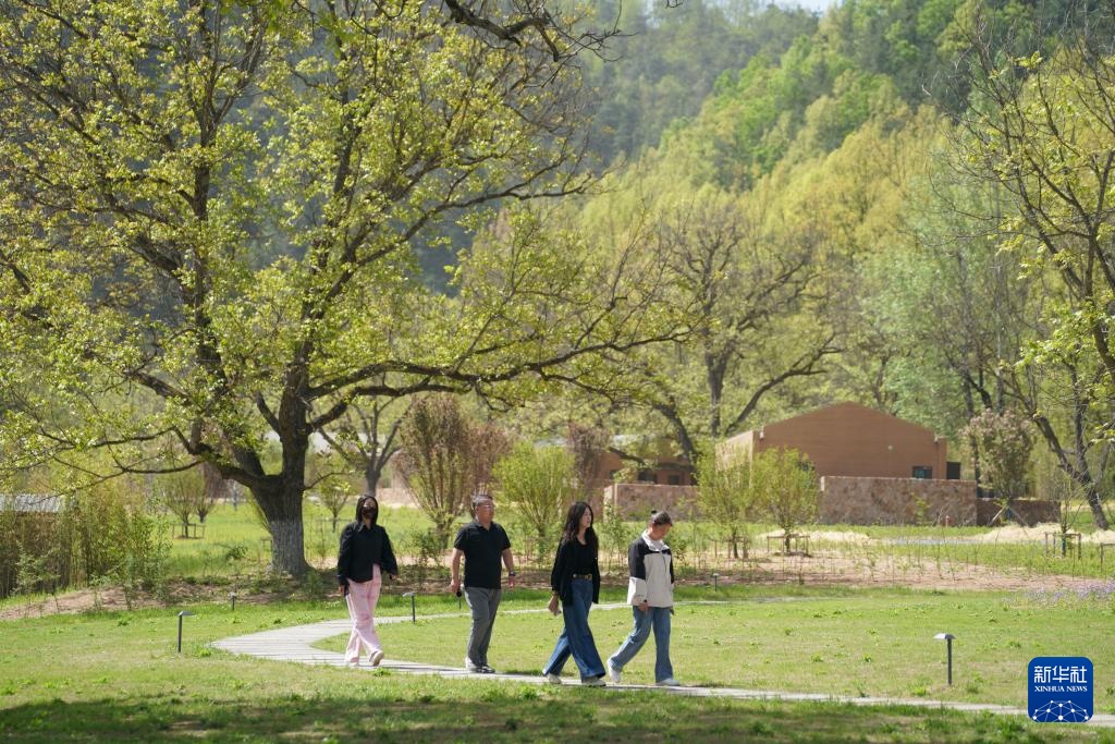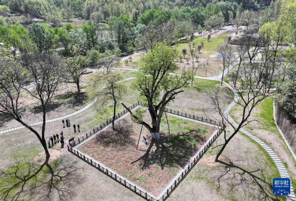 洛南县以核桃树为主题打造的桃悠谷景区景色(4月23日摄,无人机照片)。