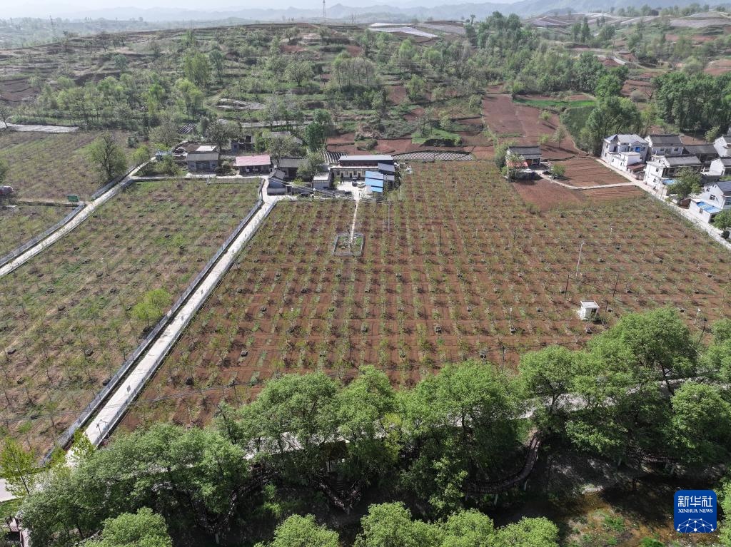洛南县景村镇八一村发展的红仁核桃基地(4月23日摄,无人机照片)。