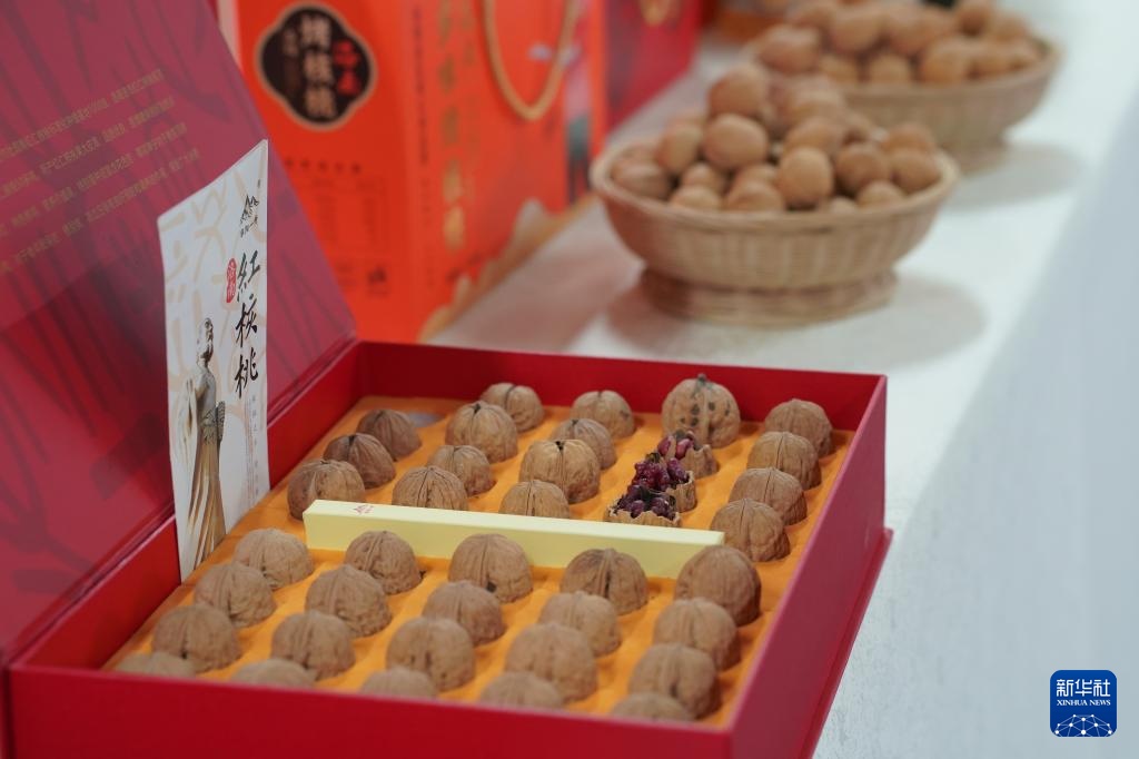 洛南县一家核桃生产企业展厅内展示的红仁核桃产品(4月22日摄)。