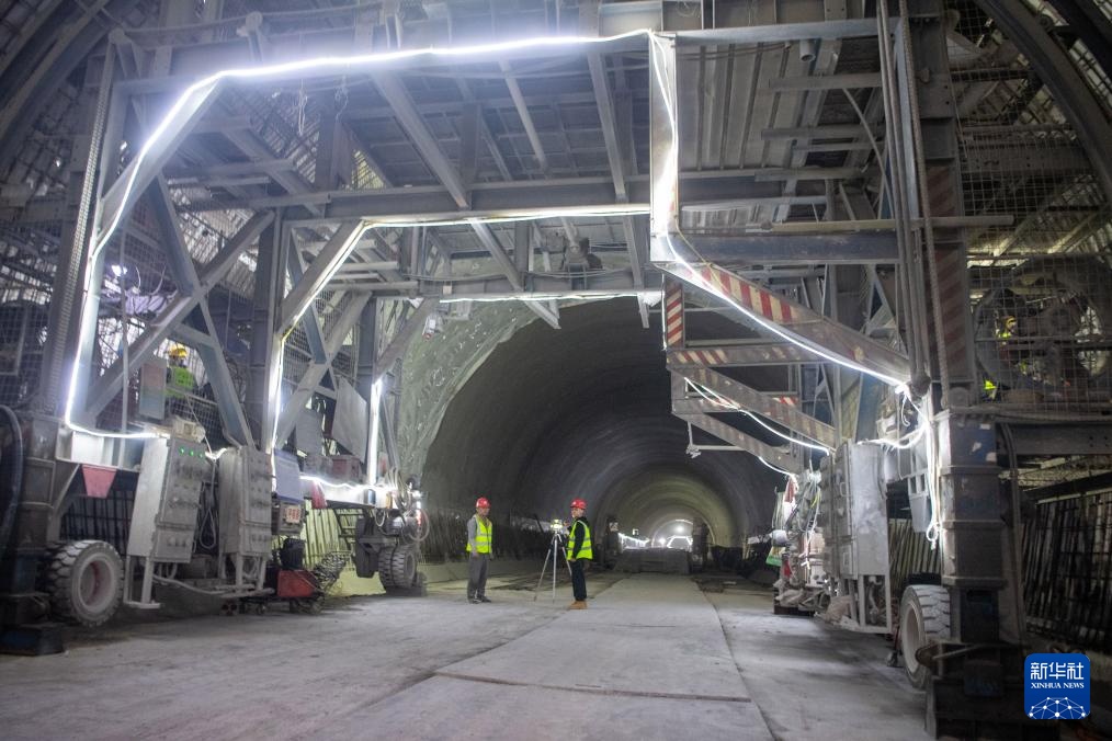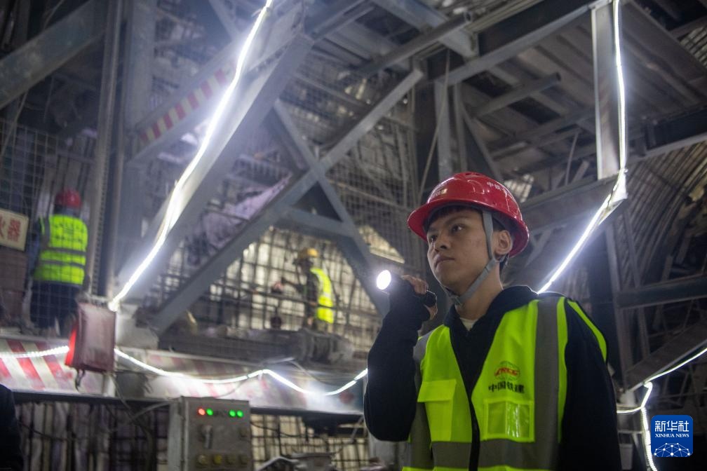 4月24日,工作人员在渝湘复线高速公路彭水隧道进行隧道贯通后的收尾工作。
