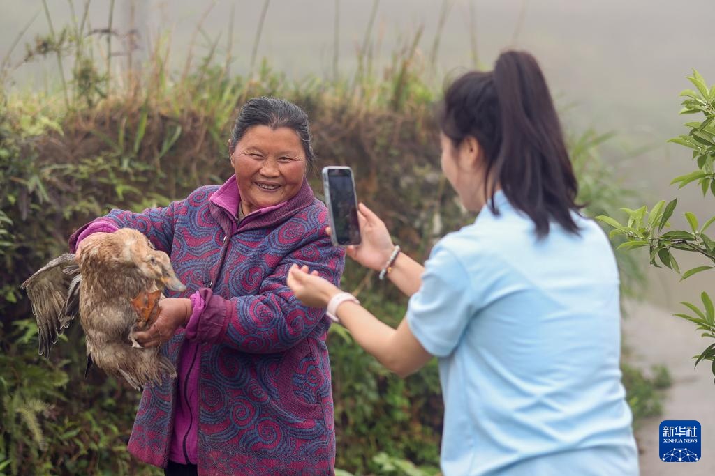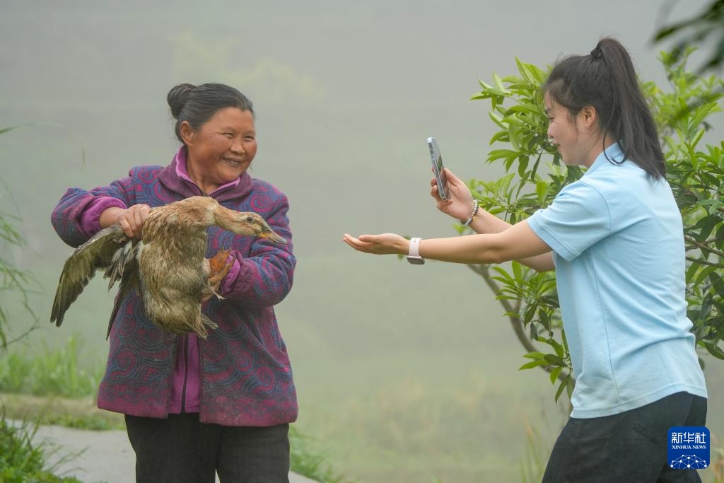4月24日,在重庆市綦江区三角镇中坝村,短视频内容创作者庞芳(右)拍摄短视频推介内容。