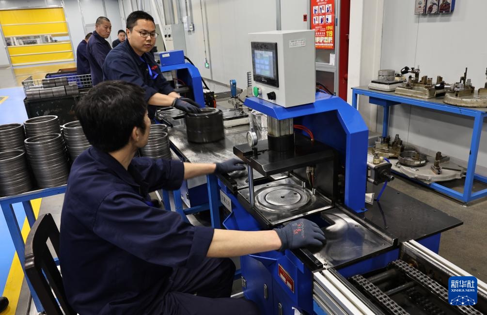 4月25日,工人在轴承组装产线上工作。