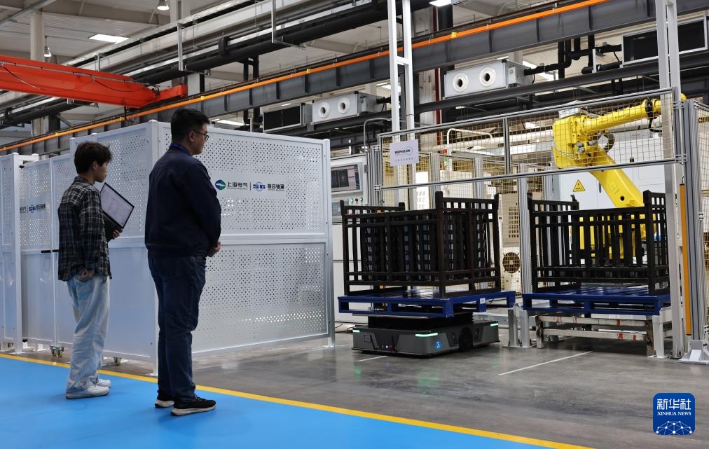 4月25日,工人和技术人员在产线上进行AGV小车与机器人的协同配合调试工作。