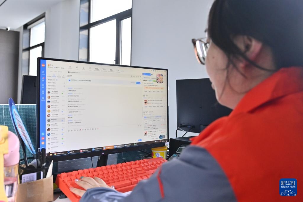 4月24日,在位于辽阳市的辽宁鑫金科技实业集团有限公司电商部内,工作人员在线上和顾客沟通。