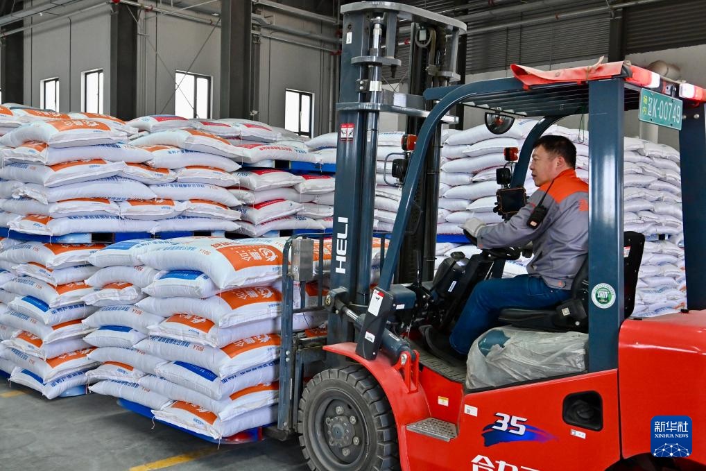 4月24日,在位于辽阳市的辽宁鑫金科技实业集团有限公司的饲料厂内,工人使用叉车搬运饲料。
