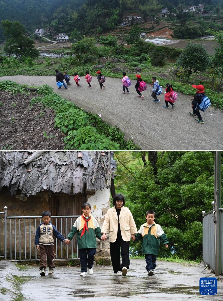拼版照片:上图:在广西全州县蕉江瑶族乡,卢加红老师领着学生回家吃午饭(2016年4月28日摄);下图:黄利老师和学生从学校外走过(2025年4月24日摄)。