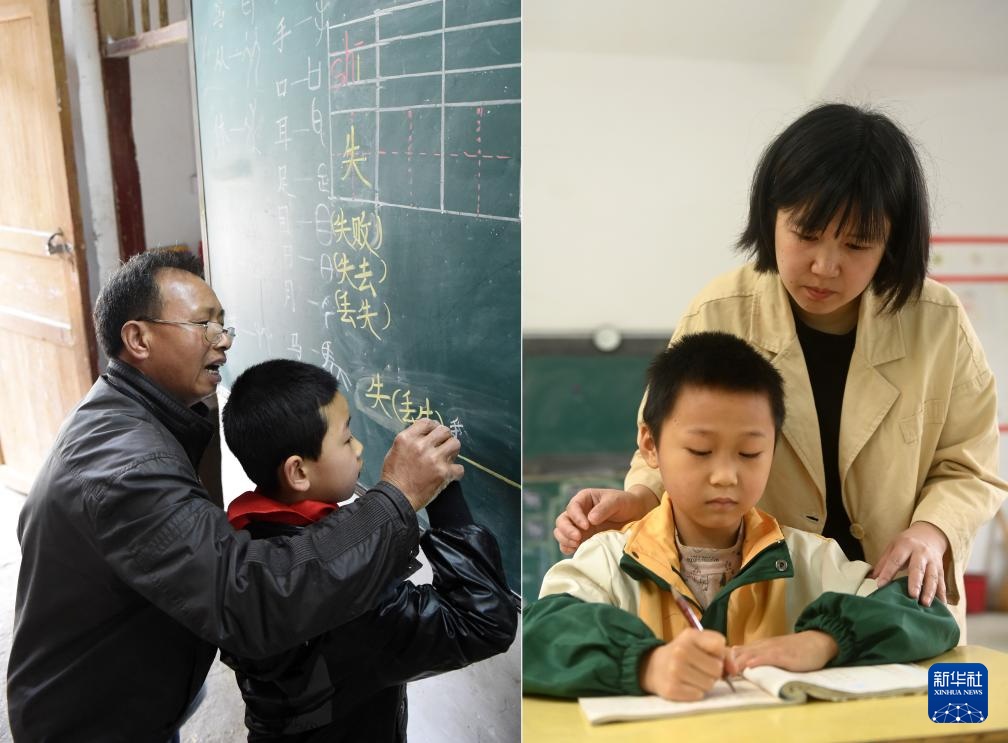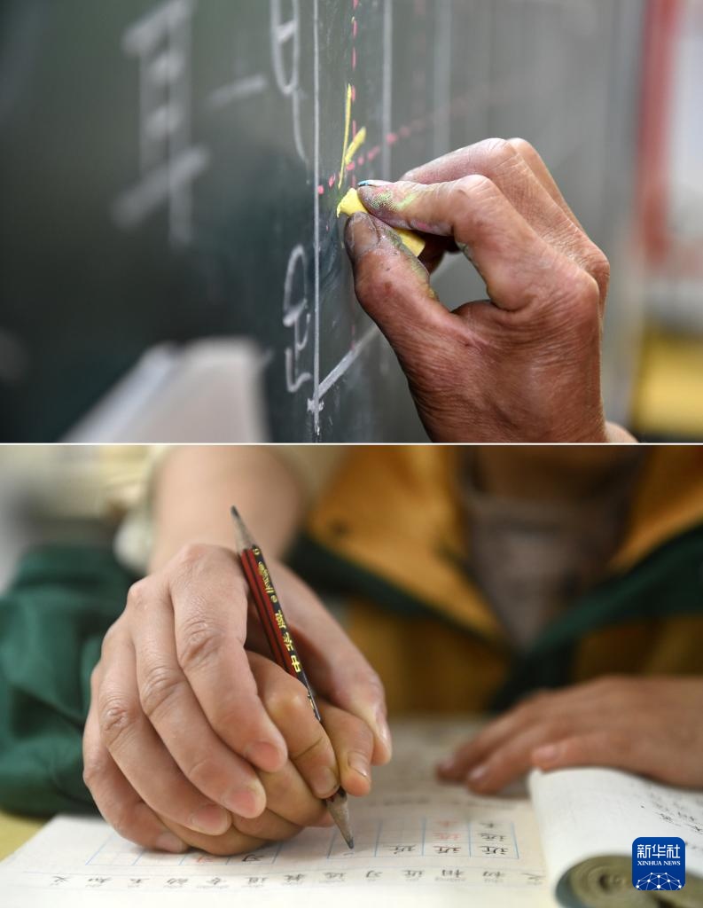 拼版照片:上图:在广西全州县蕉江瑶族乡苦马田教学点,卢加红老师在黑板上写字(2016年4月28日摄);下图:黄利老师在教一名学生写字(2025年4月24日摄)。