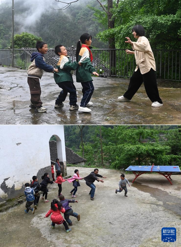 拼版照片:上图:在广西全州县蕉江瑶族乡苦马田教学点,黄利老师和学生课间做游戏(2025年4月24日摄);下图:卢加红老师课间和学生做游戏(2016年4月28日摄)。