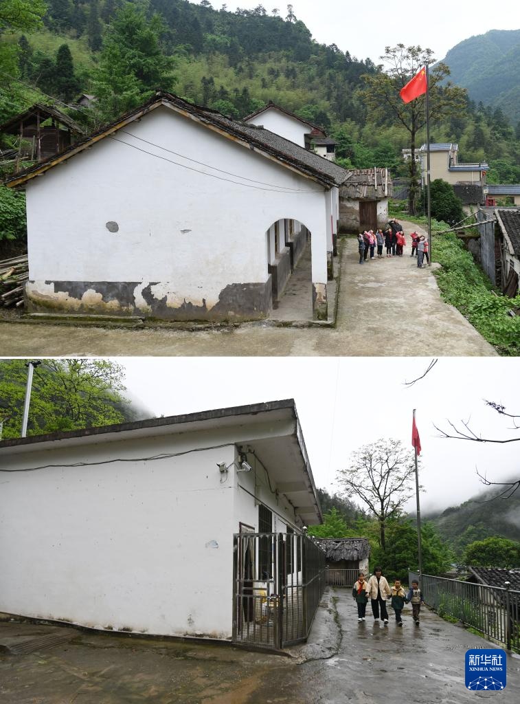 拼版照片:上图:在广西全州县蕉江瑶族乡苦马田教学点,卢加红老师和学生升国旗(2016年4月28日摄);下图:黄利老师和学生从学校外走过(2025年4月24日摄)。