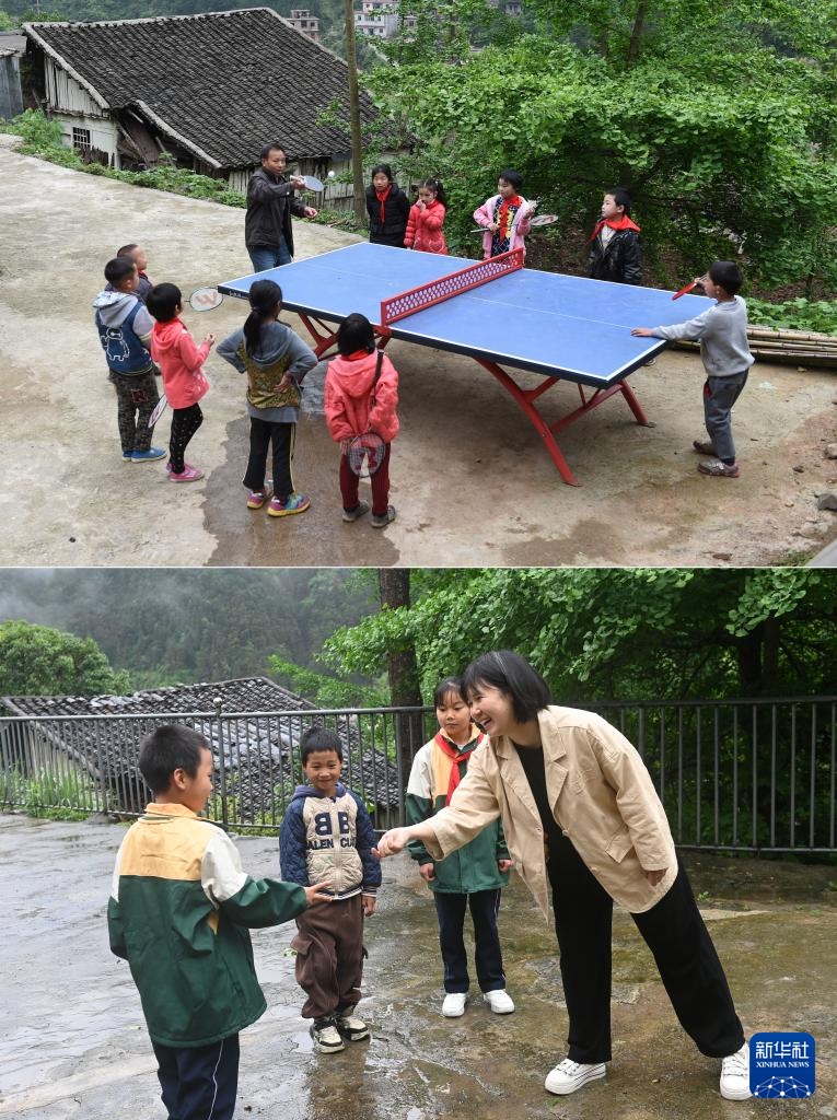 拼版照片:上图:在广西全州县蕉江瑶族乡苦马田教学点,卢加红老师和学生课间打乒乓球(2016年4月28日摄);下图:黄利老师课间和学生做游戏(2025年4月24日摄)。