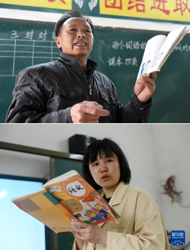 拼版照片:上图:在广西全州县蕉江瑶族乡苦马田教学点,卢加红老师给学生上课(2016年4月28日摄);下图:黄利老师给学生上课(2025年4月24日摄)。
