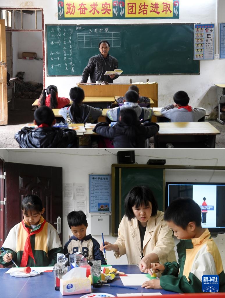 拼版照片:上图:在广西全州县蕉江瑶族乡苦马田教学点,卢加红老师给学生上课(2016年4月28日摄);下图:黄利老师在教学生画画(2025年4月24日摄)。