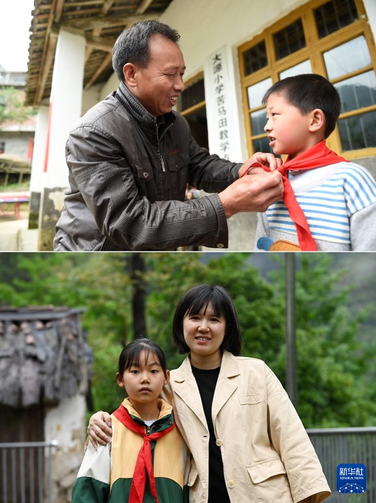 拼版照片:上图:在广西全州县蕉江瑶族乡苦马田教学点,卢加红老师帮一名学生系红领巾(2016年4月28日摄);下图:黄利老师和一名学生在一起(2025年4月24日摄)。